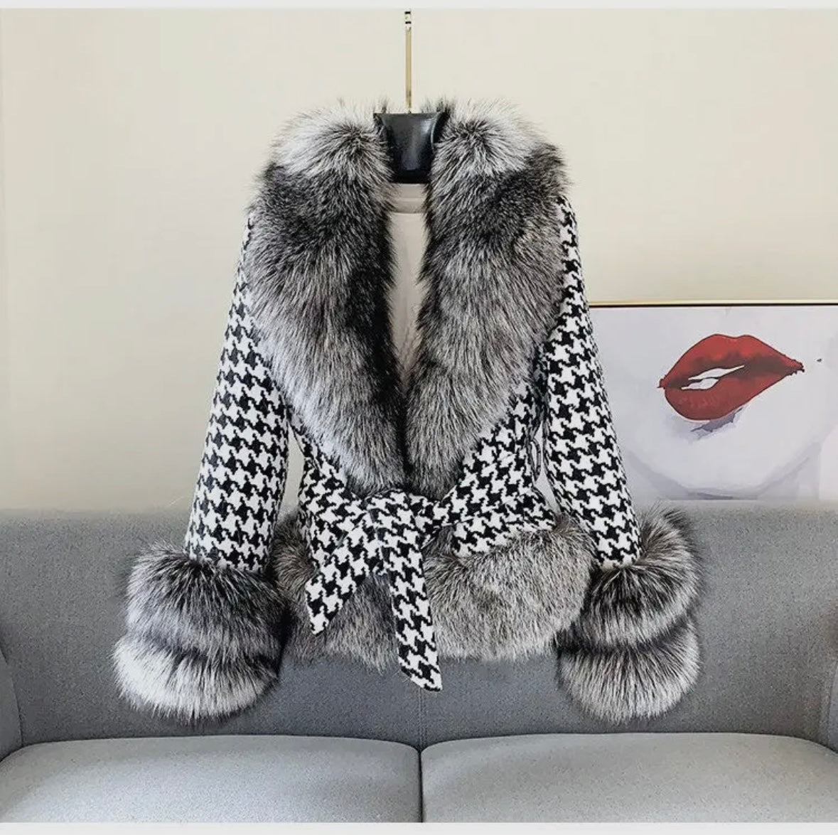 Elevate your winter wardrobe with this chic houndstooth faux fur cropped coat!