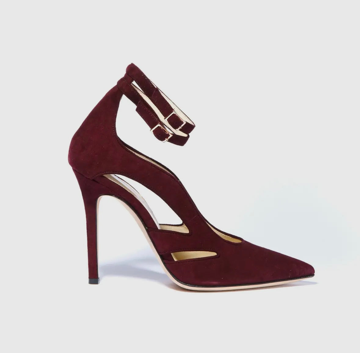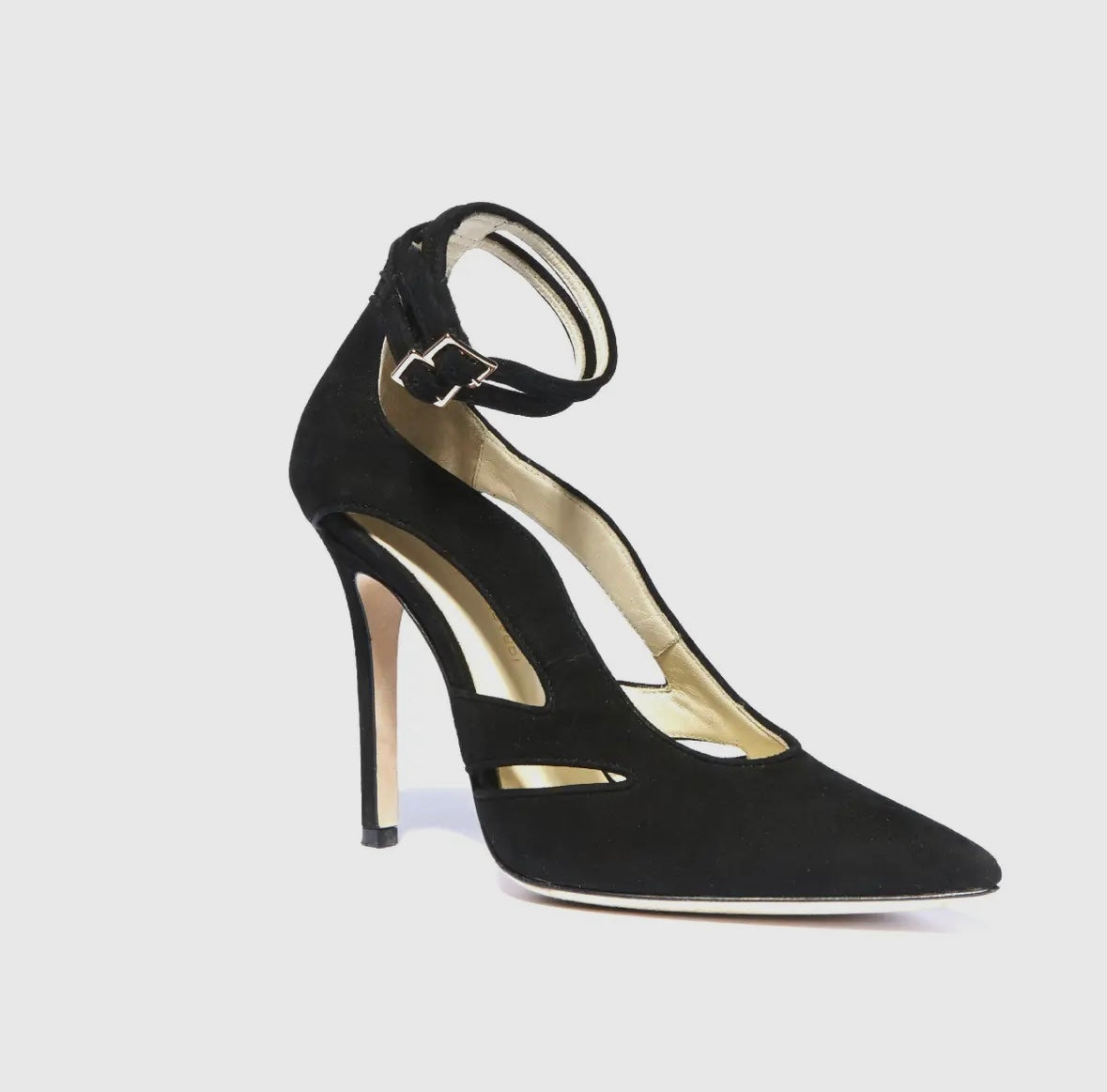 Christina Lombardi’s sensuous, flirty cut-out ankle straps wrapped heel. An extremely flattering silhouette and rose gold buckles will elevate any look!